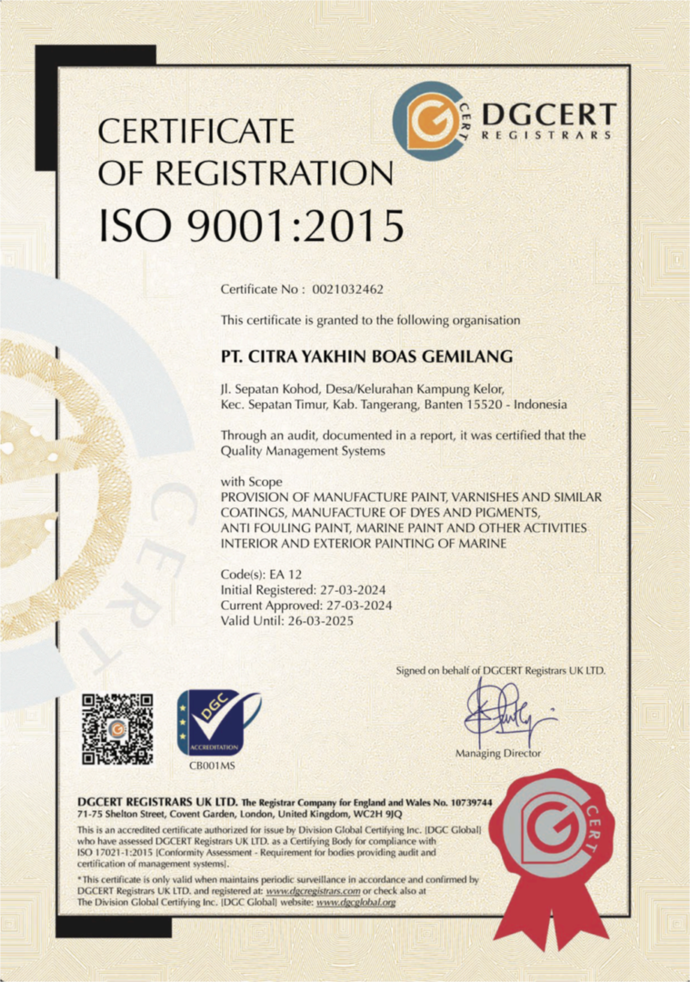 Yokatta Paint berdedikasi untuk menjaga standar kualitas dan keamanan tertinggi. Produk kami telah disertifikasi oleh Biro Klasifikasi Indonesia, dan kami mematuhi standar industri yang ketat, termasuk ISO 9001 : 2015.